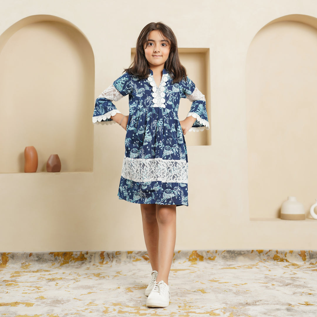 'Navy Blue Fern' Girl's Cotton Dress