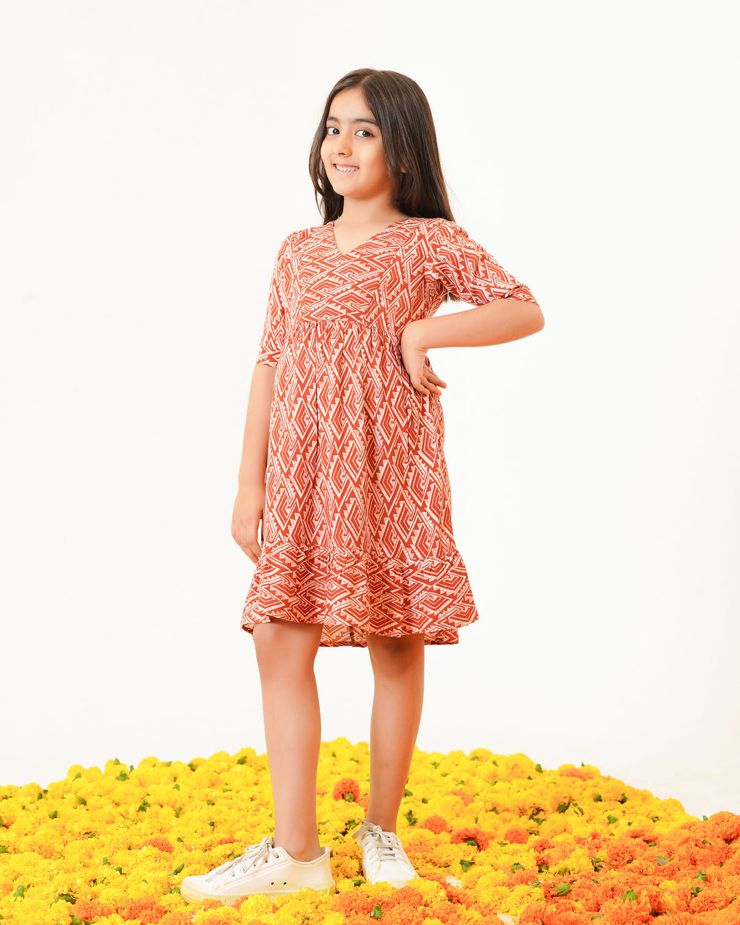 Rust Drape Printed Girl's Dress