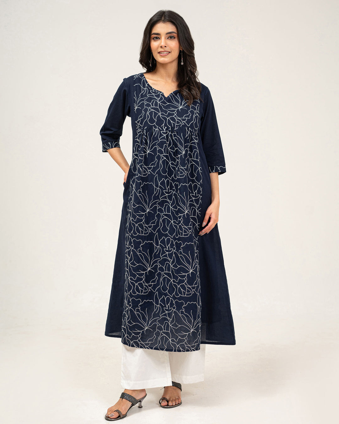 Navy Blue Embroidered Pure Cotton Kurta