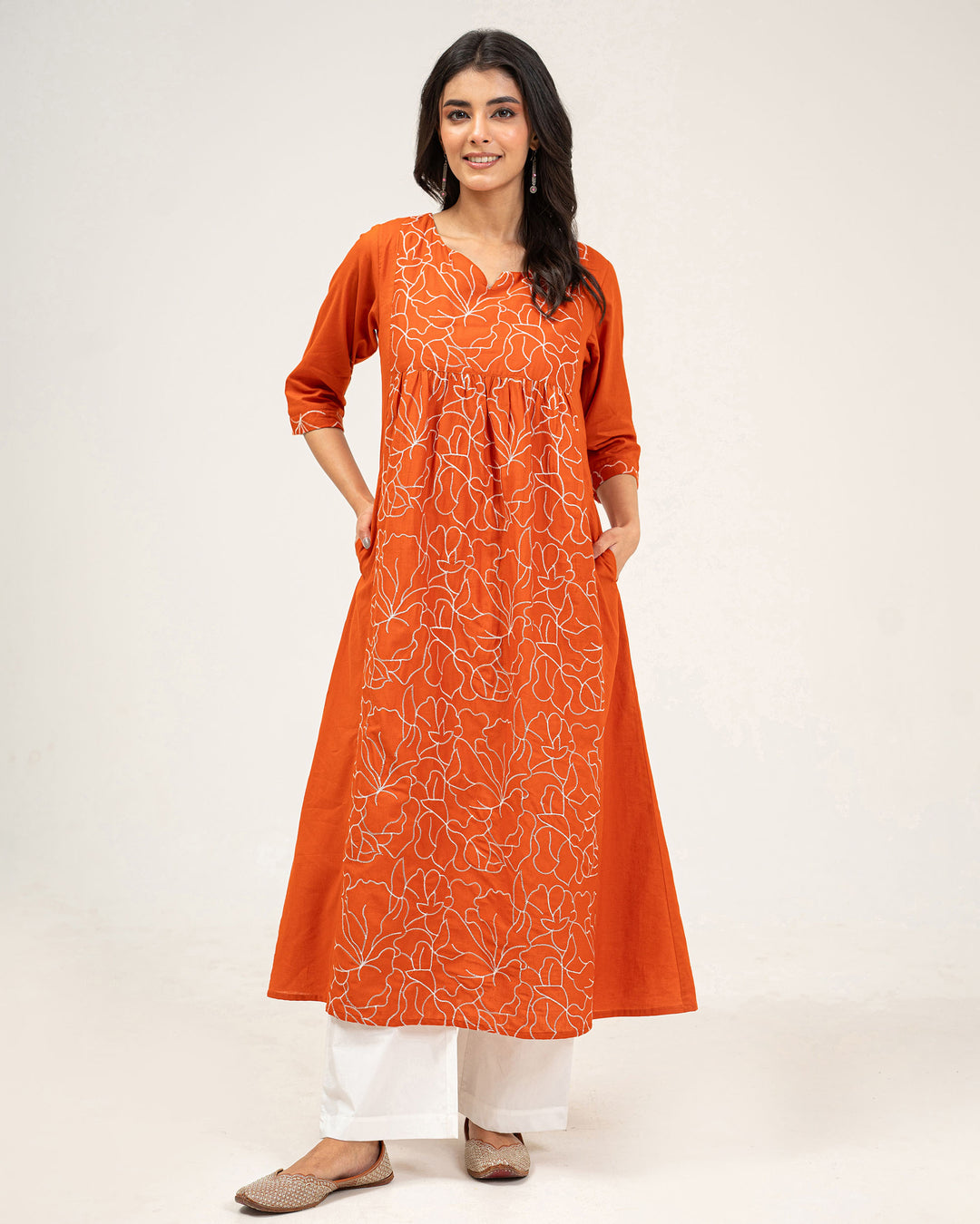 Orange Embroidered Pure Cotton Kurta