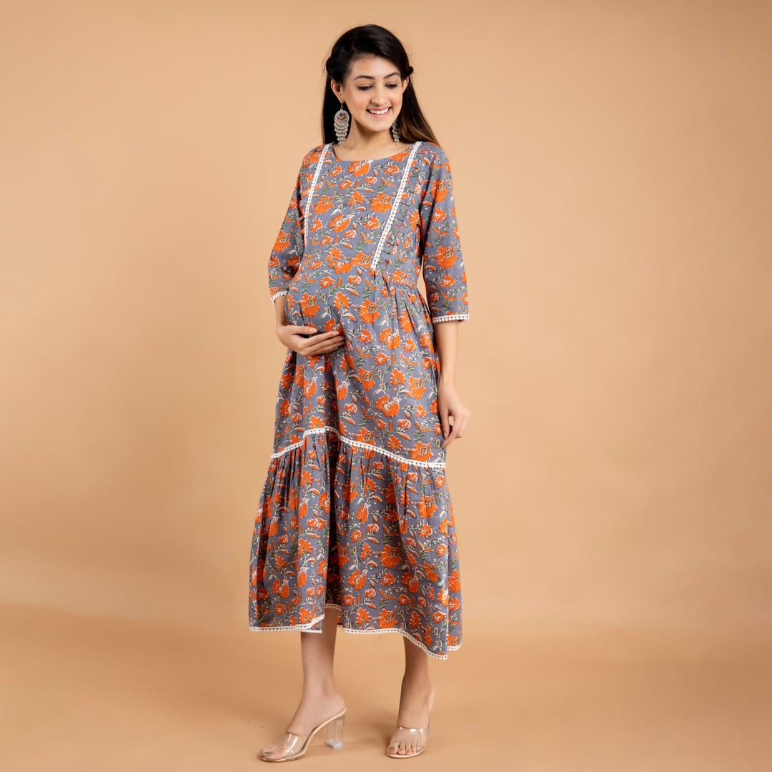 Cotton Grey-Orange Flower Lace Work Maternity Dress