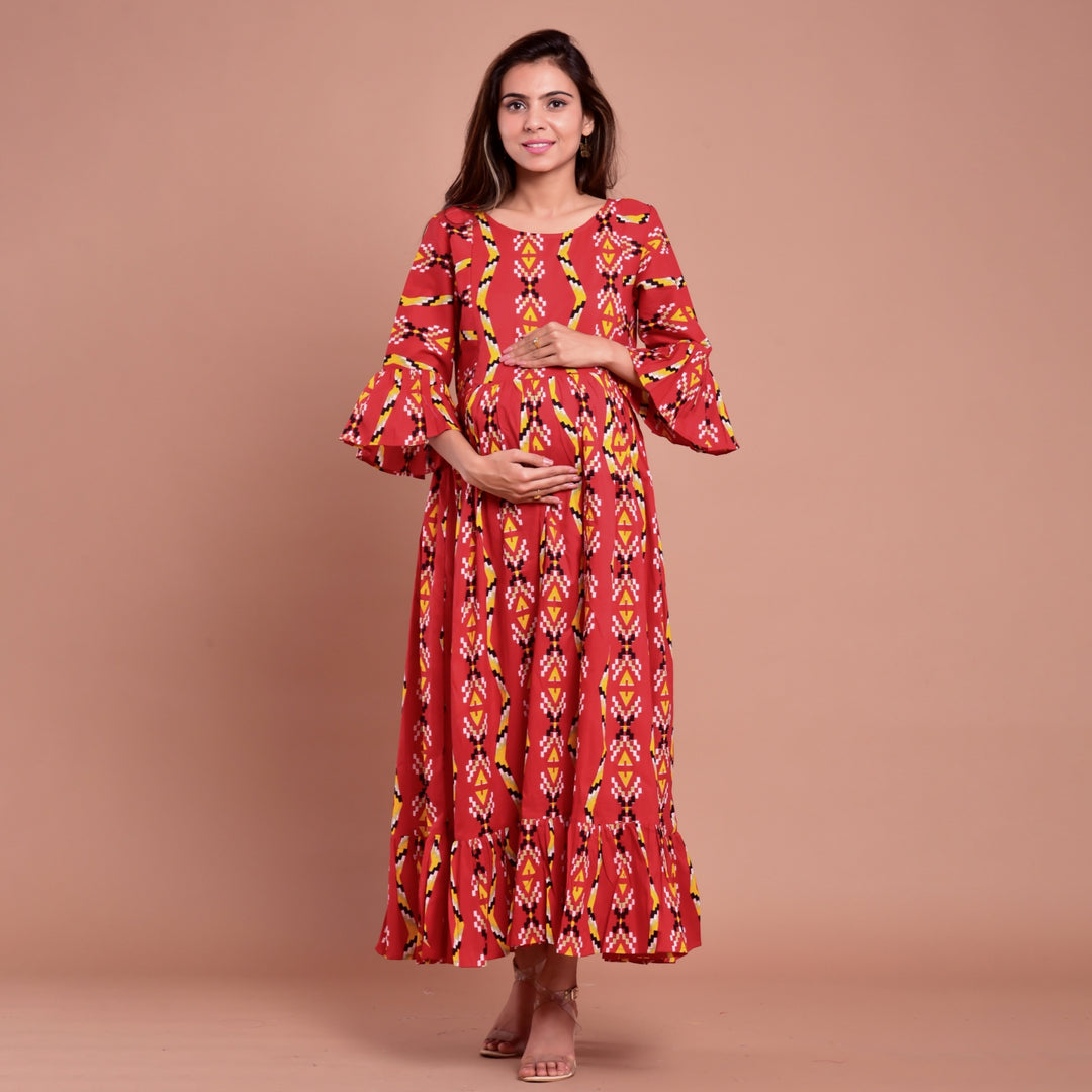 Cotton Red Zigzag Frilled Long Maternity Dress