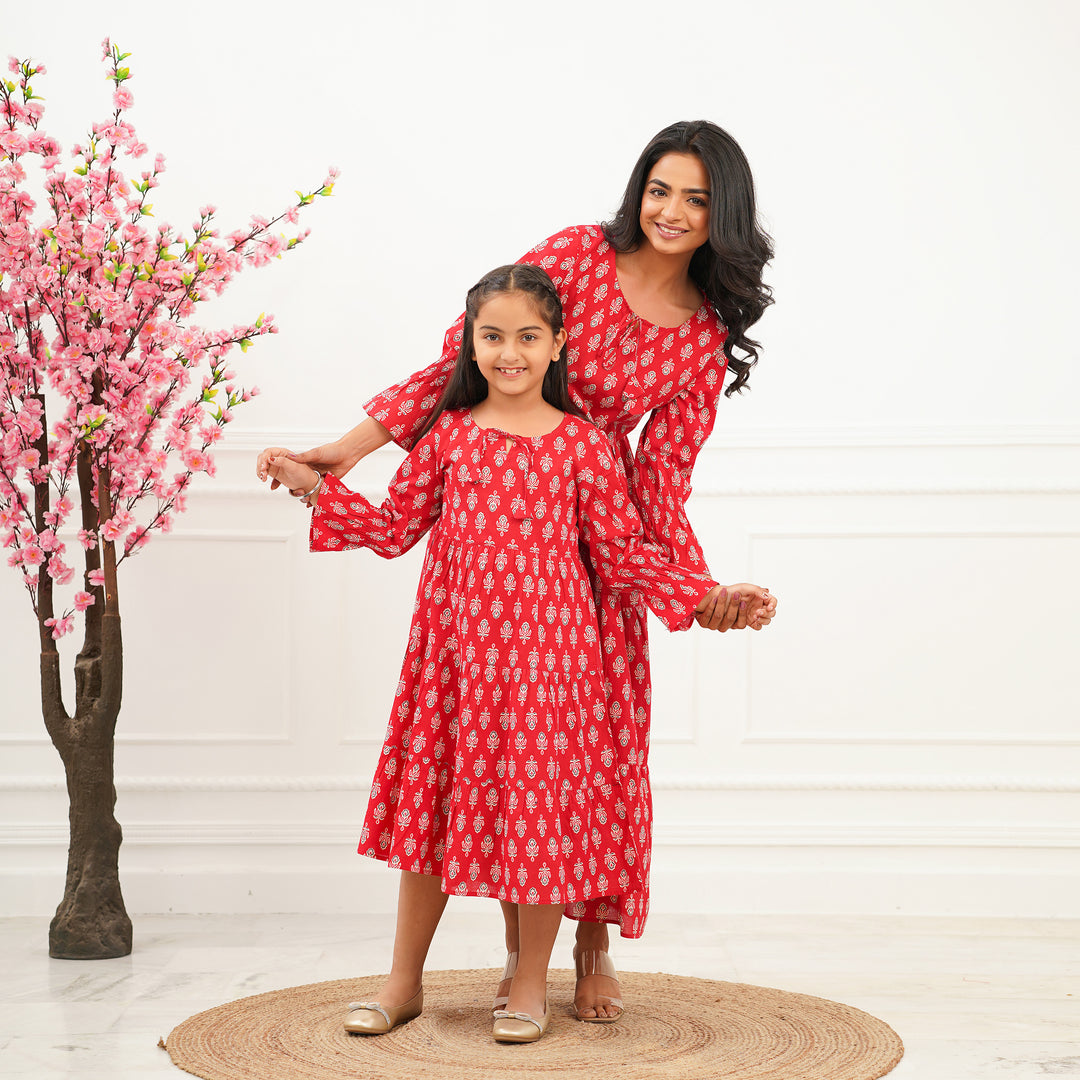 Red Booti Mom and Daughter 3-Tiered Cotton Dresses